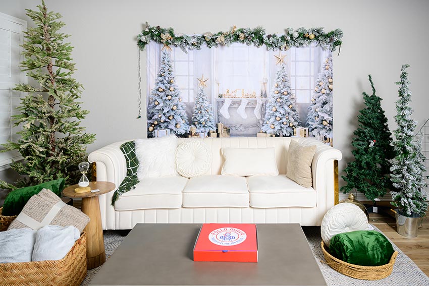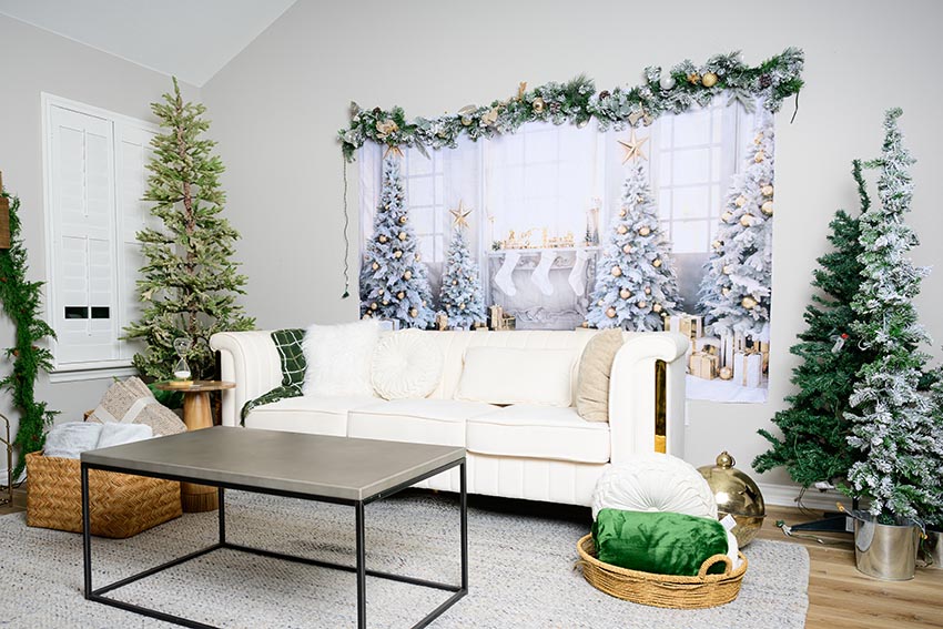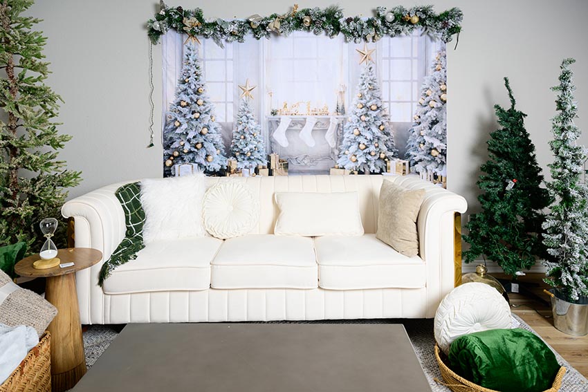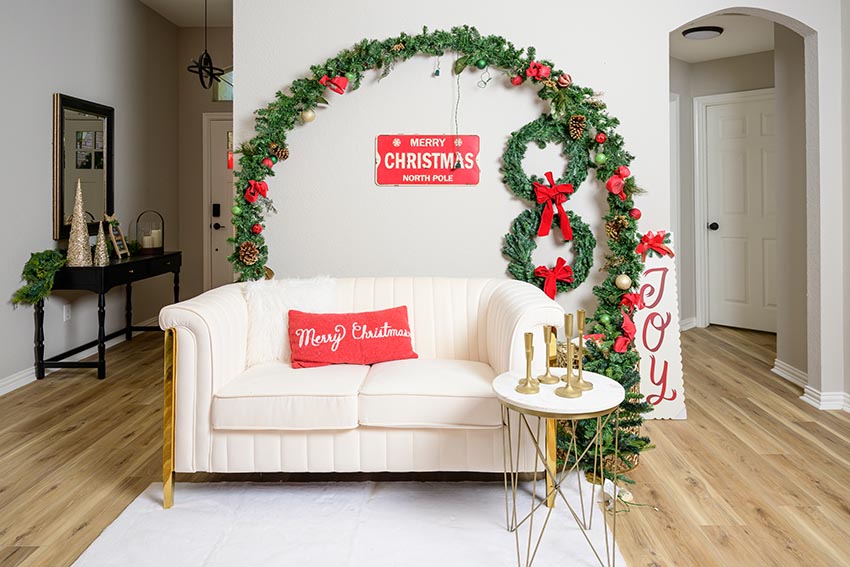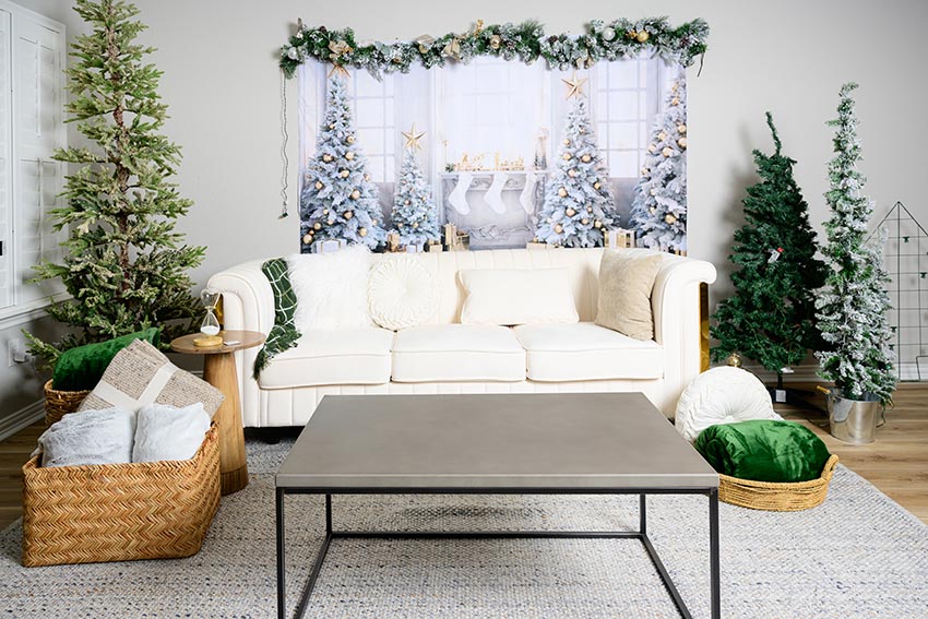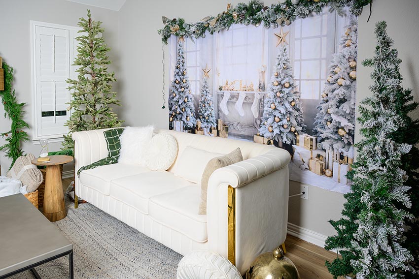 Rincones acogedores con sofás y accesorios navideños.
